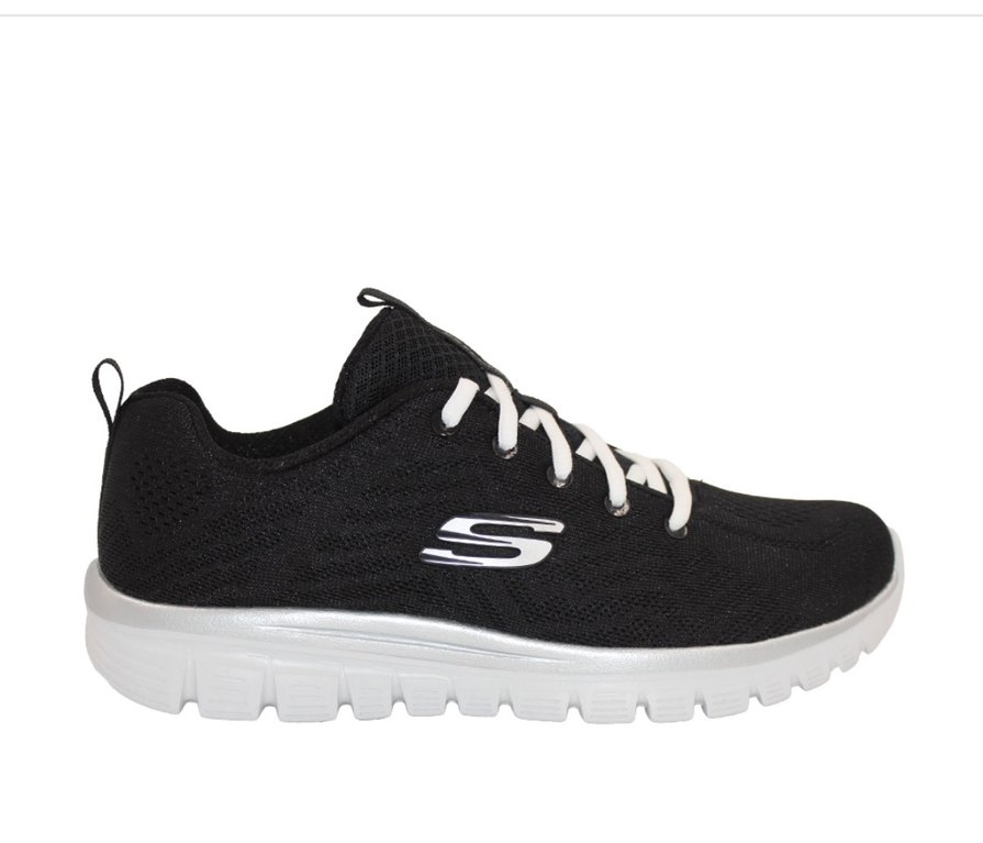 Skechers marka siyah, desen içermeyen, elastik malzemeden yapılmış, beyaz tabanlı kadın spor ayakkabısı. İnce topuklu ve sokak stili için uygundur Kutusunda sıfır orijinal ürün