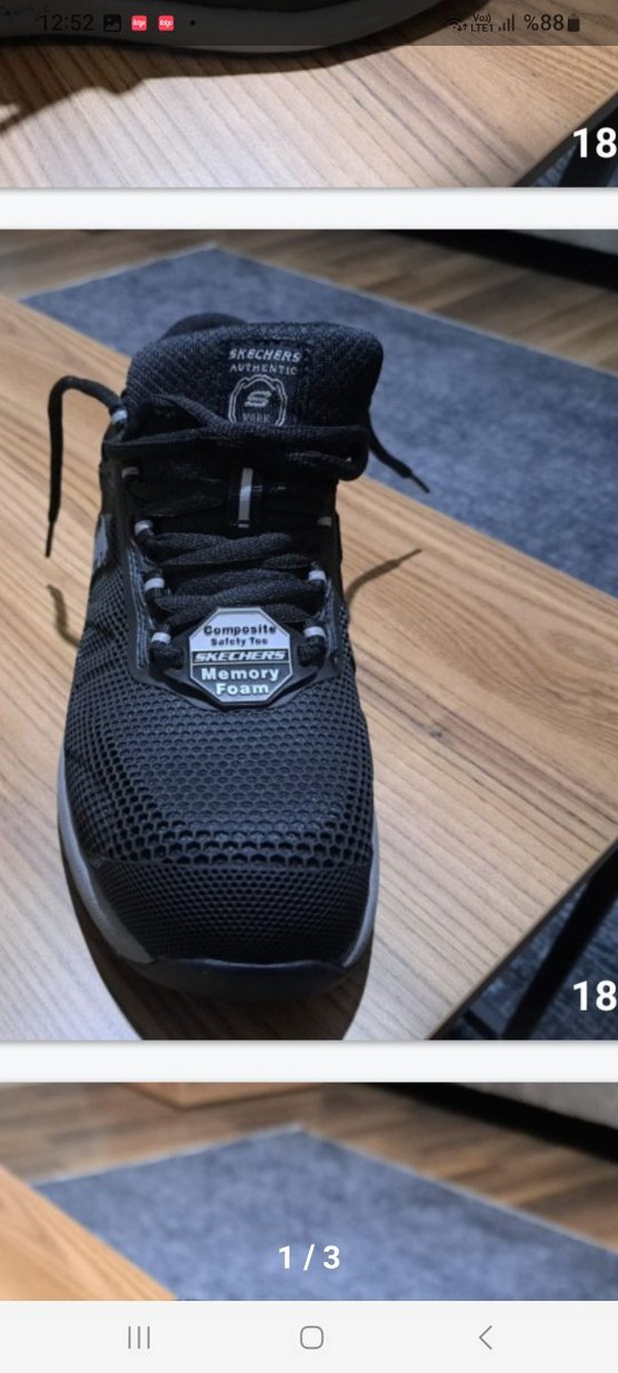 Skechers erkek spor ayakkabısında siyah bağcıklar, hafızalı köpük ve kompozit koruyucu burun detaylarıyla sokak stili için uygun.