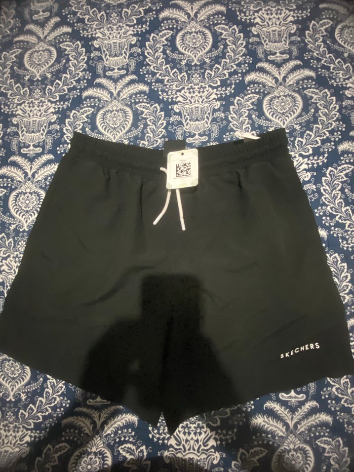 Skechers marka siyah, bol kesim, erkek mini deniz şort. Hafif desenli, günlük rahat kullanım için uygundur.