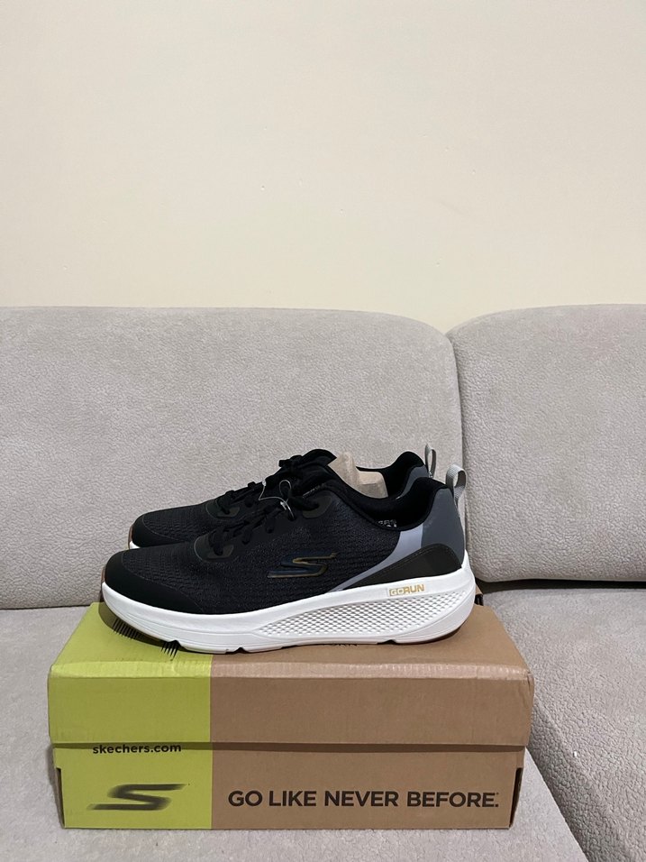 Skechers markalı, siyah renkte, platform topuklu ve cırt cırt detaylı spor ayakkabı. Kauçuk tabanlı, "GO LIKE NEVER BEFORE" yazılı.