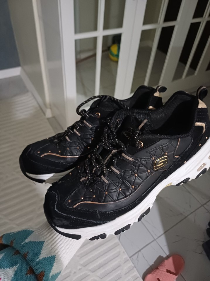 Skechers markalı siyah yılan desenli, bağcıklı ve platform tabanlı spor ayakkabılar. Şehir stiline uygun rahat tasarım.
