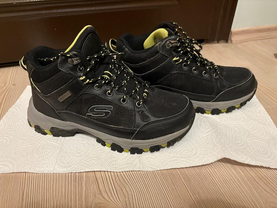 Skechers marka siyah erkek waterproof özellikte 40 numara bot, koyu sarı detaylarla, bağcıklı ve dayanıklı tabanlı, sokak tarzına uyg