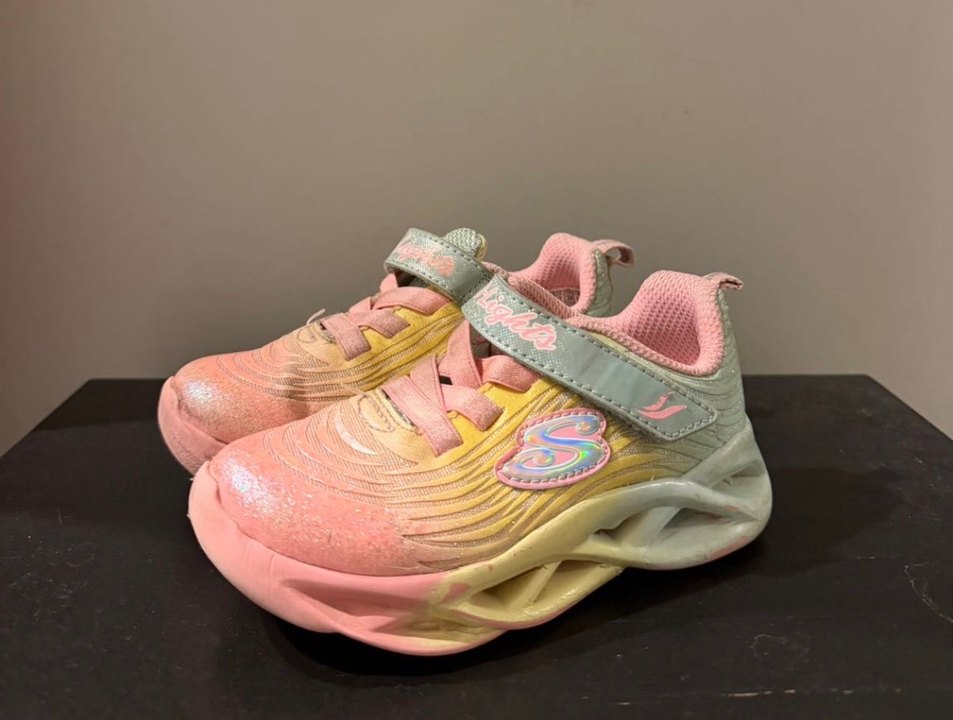 Skeckers desenli, lastik tabanlı kız çocuk spor ayakkabısı, cırt cırtlı, rahat ve sokak stiline uygun. Pili değişirse ışıklıdır