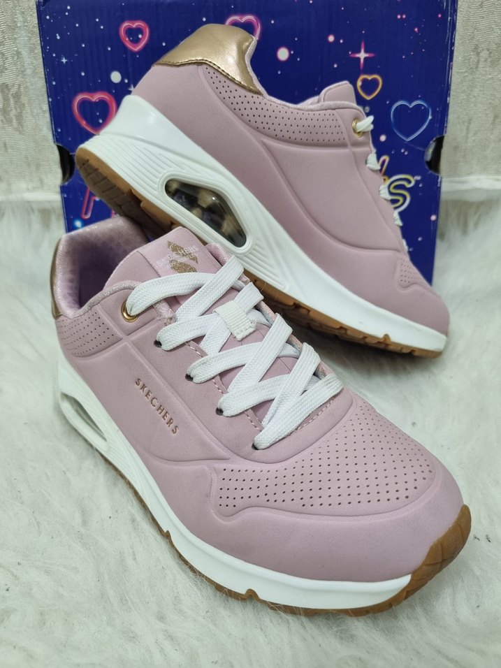 Pembe dolgu topuklu spor ayakkabı, beyaz bağcıklı ve kauçuk tabanlı. Nefes alabilen delikli detaylara sahip, spor ve günlük sokak stiline uygun. ürün 2-3 defa kullanildi 33.5 numara