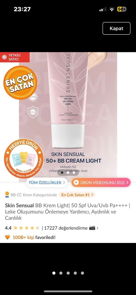 Skin Sensual BB Krem Light, SPF 50 UVA/UVB koruması sağlar. %2 Arbutin, C Vitamini ve Hyaluronik Asit ile leke oluşumunu önlemeye, aydınlık ve canlılık kazandırmaya yardımcı olur. ✨⭐️Hiç kullanılmadı kutusu ile birlikte gönderilecektir. pazarlık payı vardır.