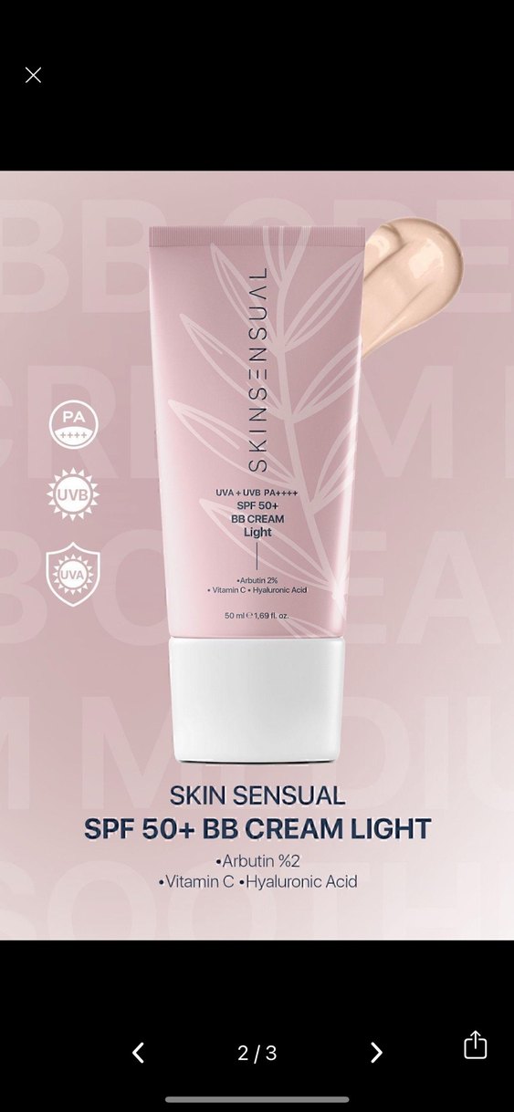 Skin Sensual SPF 50+ BB Krem, 2% Arbutin, Vitamin C ve Hyaluronik Asit içeriğiyle cildi korur ve bakım sağlar. Açık ton bej rengindedir. Sadece denedim iki rengini almıştım diğeri olduğu için bunu satıyorum