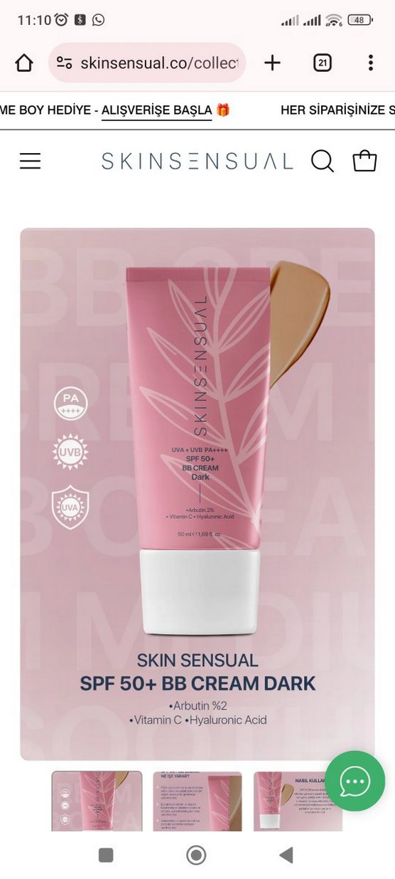 Skin Sensual SPF 50+ BB krem koyu bej tonunda, yüksek güneş koruması sağlar. %2 arbutin, C vitamini ve hyaluronik asit içerir.