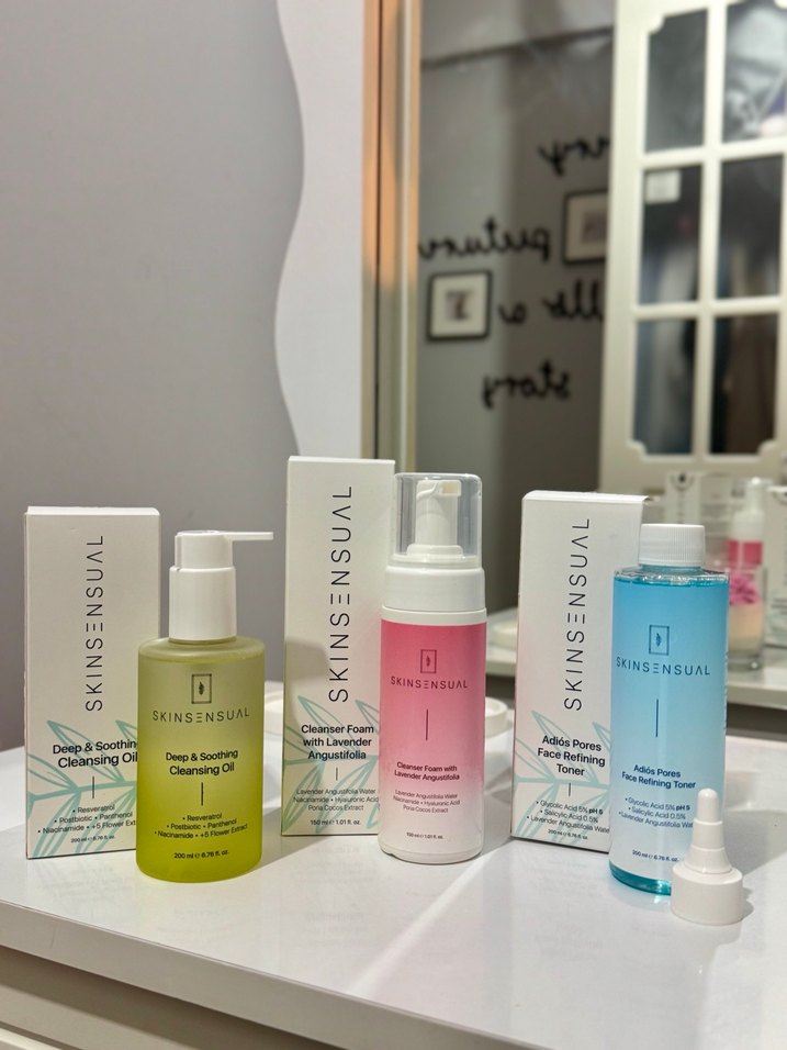 Skin Sensual yüz temizleyiciler; derinlemesine yatıştırıcı yağ, lavantalı köpük temizleyici ve gözenek sıkılaştırıcı tonerden oluşur. Cildi nazikçe temizler ve tazeler.