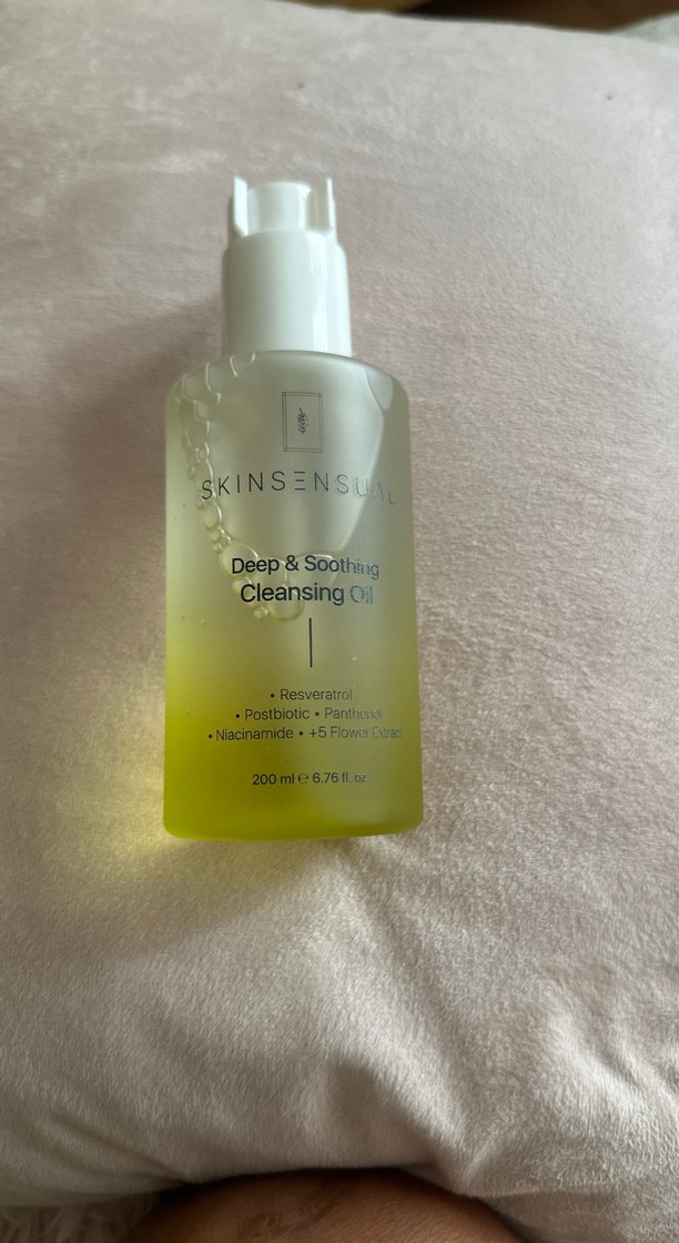Skinsensi Derinlemesine ve Yatıştırıcı Temizleme Yağı, cildi nazikçe temizleyen resveratrol, postbiyotik, panthenol, niasinamid ve 5 çiçek özü içerir. 200 ml pompalı şişede sunulur.
