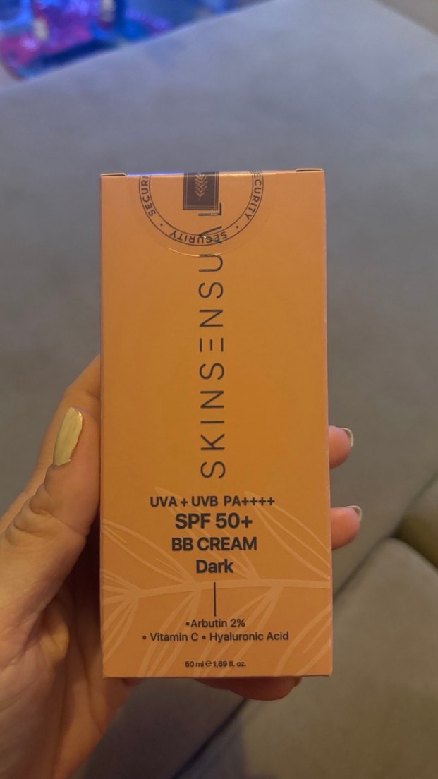 SKINSENSU BB Krem koyu bej tonunda, SPF 50+ UVA ve UVB koruması sağlar. %2 Arbutin, C Vitamini ve Hyaluronik Asit içerir. Koyu tenlere uygundur. Sıfır, bandrollü