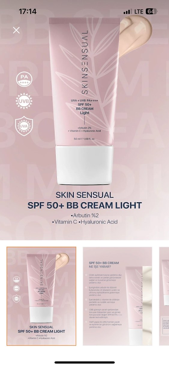 SKINSENSUAL açık bej renginde BB krem, SPF 50+ ile UVA ve UVB koruması sağlar. C vitamini ve hyaluronik asit içerir. 50 ml.