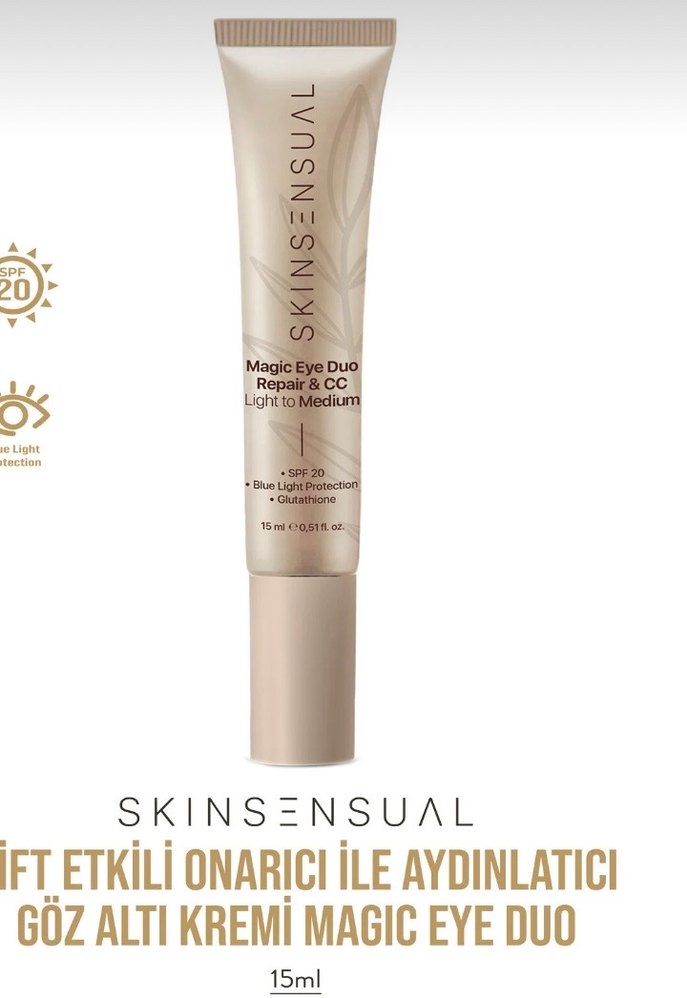 Skinsensual Magic Eye Duo, açık ve orta ten tonları için bej renkli, onarıcı ve aydınlatıcı özellikte BB kremdir. SPF 20 ve mavi ışık koruması içerir. Glutatyon ile zenginleştirilmiştir.