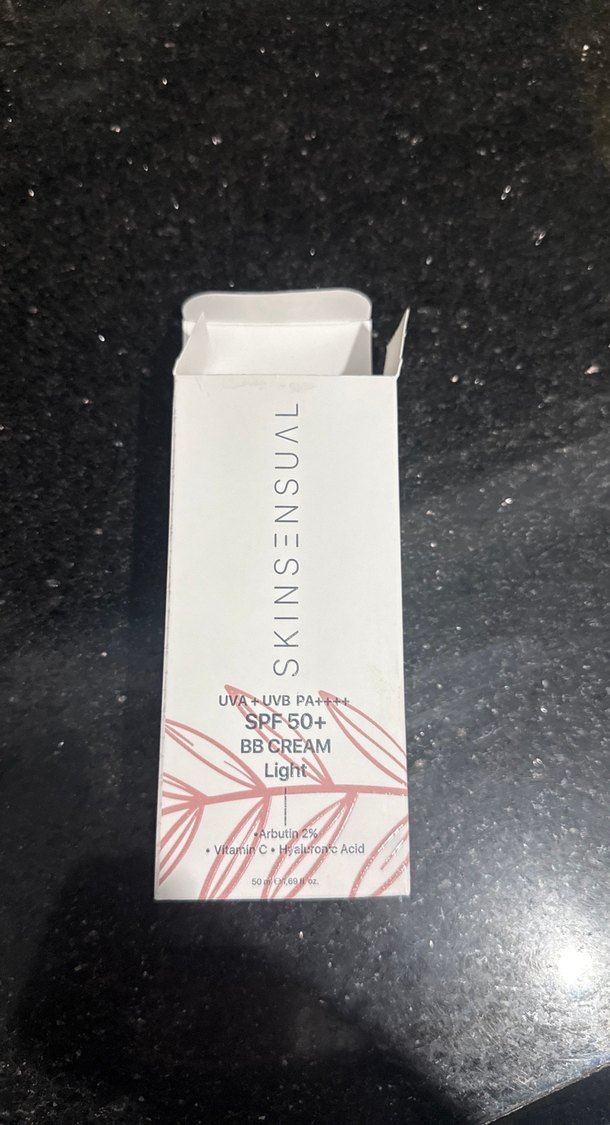Skinsensual açık ton BB krem, SPF 50+ koruma sağlar. Arbutin, vitamin C ve hyaluronik asit içerir.