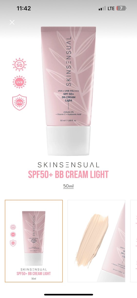 Yenidir. %98 dolu.2 defa sürdüm.SKINSENSUAL açık ton BB krem, SPF50+ koruma ve UVA+UVB filtreleri içerir. Arbutin, Vitamin C ve Hyaluronik Asit ile cilt bakımına destek olur. 50ml boyutundadır.