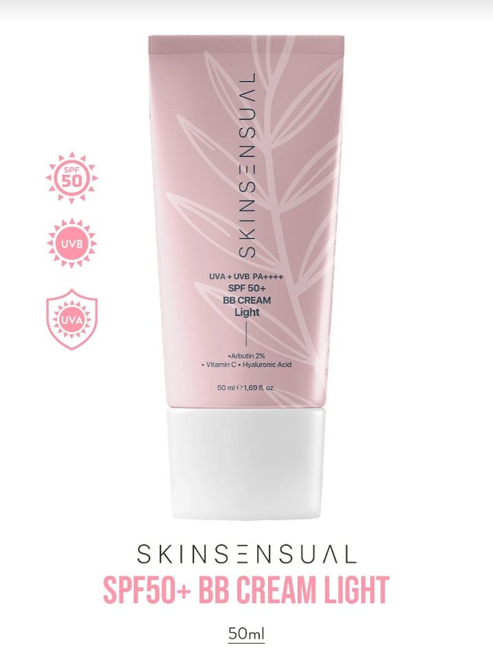 Skinsensual SPF50+ BB Krem Açık Ton 50ml, arbutin, C vitamini ve hyalüronik asit içerir. yüksek güneş koruması sağlar. hiç açılmadı