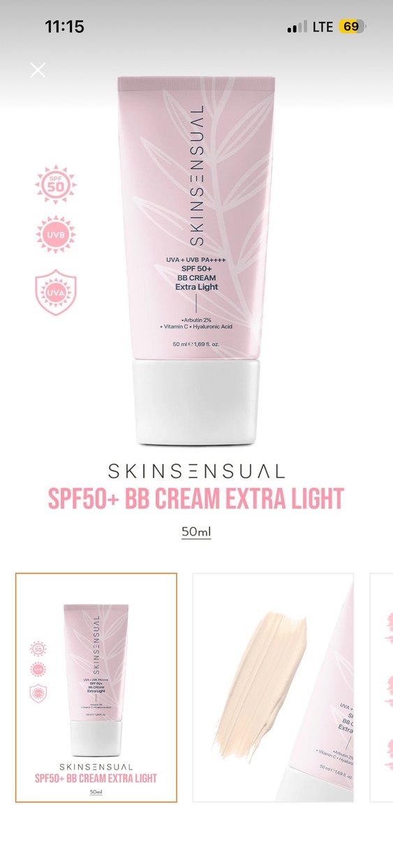 sayılı kullandım ürünün yarısı bile kullanılmadı elimde tarihi yakın başka ürünler var onları bitirmek icin satıyorum markanın light rengini de defalarca kez almıstım rengi bana cok az acık kaldı sabitlemeye gerek bile yok cok güzel bir ürün güneş koruyucu etkisi de bulunuyor konforlu bir ürün TARİHİ YENİDİR SKT KOYABİLİRİM SORAN OLURSA SPF50+ BB Krem Extra Light, Vitamin C, Arbutin ve Hyaluronik Asit ile cildi besler, hafif kapatıcılık ve güneş koruması sağlar. SkinSensual BB cream cildin aydınlanmasına, yardımcı olur, daha esnek ve parlak görünmesini sağlar ve kusurları gizlemeye yardımcı olur. Arbutin ile düzenli kullanımda cilt lekelerini azaltıcı etkisi ve cilt tonu eşitsizliklerini giderici etkisi o. Yine içerisindeki c vitamini ile cildinize parlaklık ve canlılık veriyor. ic