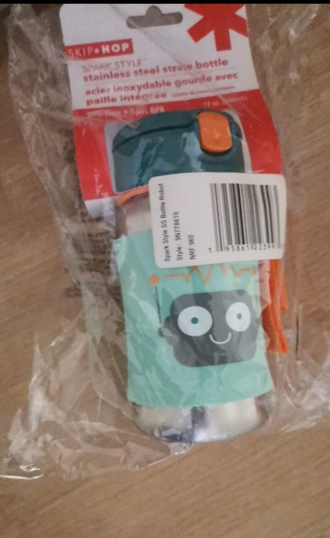 Turkuaz ve gri renkte, Skip Hop markalı, paslanmaz çelik pipetli çocuk matarası. Dayanıklı malzemeden yapılmış, robot desenli.