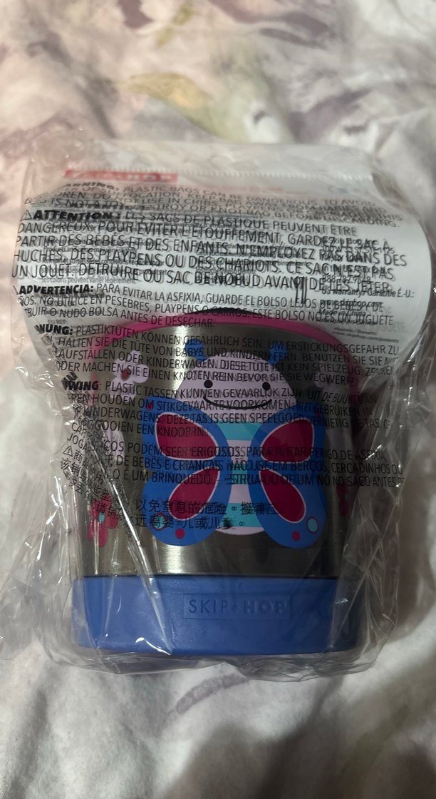 Skip Hop markalı, mavi ve gri renkte çocuk termosu. Üzerinde kelebek deseni bulunur ve içecekleri sıcak tutar. Orjinal ve sıfır üründür.