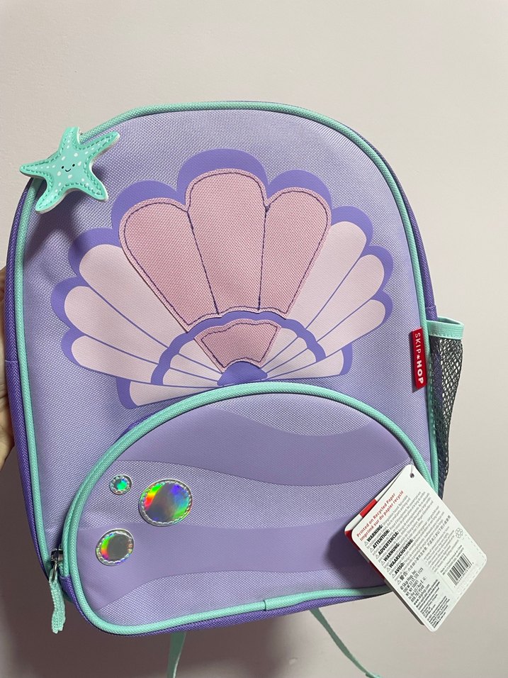 Pastel mor renkte, deniz kabuğu desenli çocuk sırt çantası. Holografik detaylar ve deniz yıldızı fermuar süsü bulunur. Ön cep ve yan file bölmesi vardır.