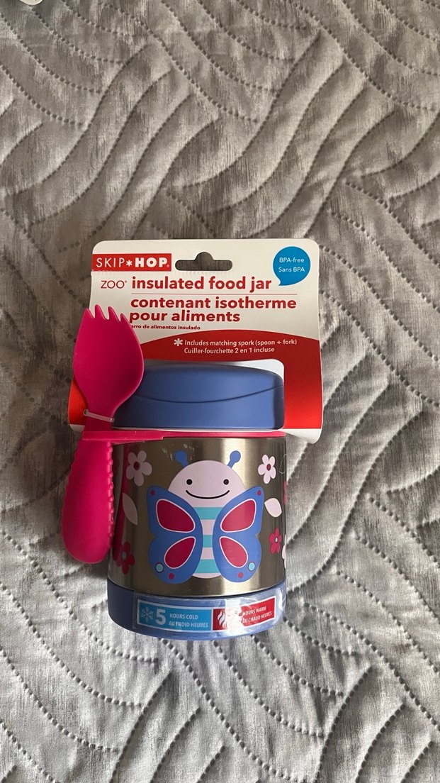 Skip Hop markasına ait pembe renkli, kelebek desenli gri izoleli çocuk yemek kavanozu. Eşleşen 2'si 1 arada kaşık ve çatal içerir. BPA içermez, yiyeceği saatlerce sıcak veya soğuk tutar.