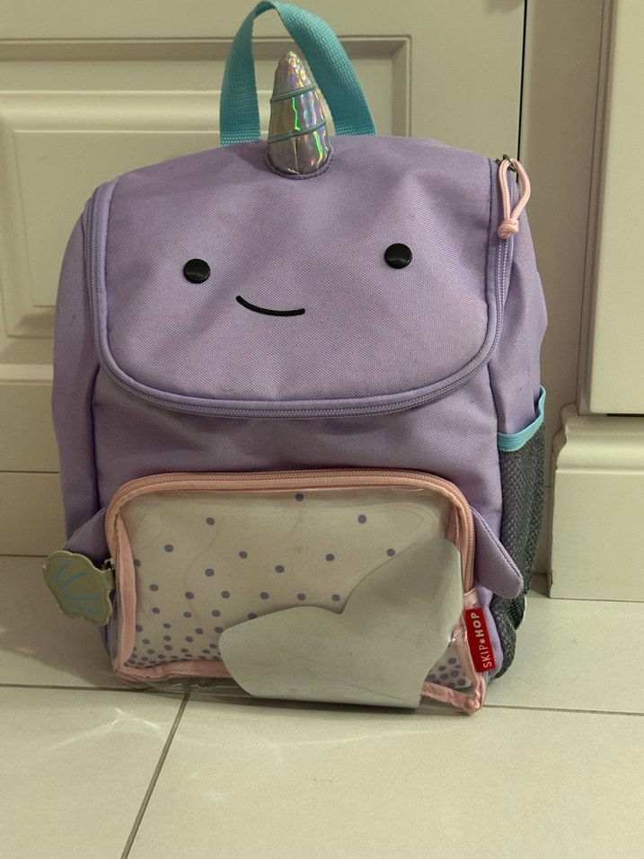 Mor pastel renkte, unicorn boynuzu ve gülen yüz detaylı çocuk sırt çantası. Önünde şeffaf kalp desenli cep, turkuaz kulp ve yan file cep bulunur.