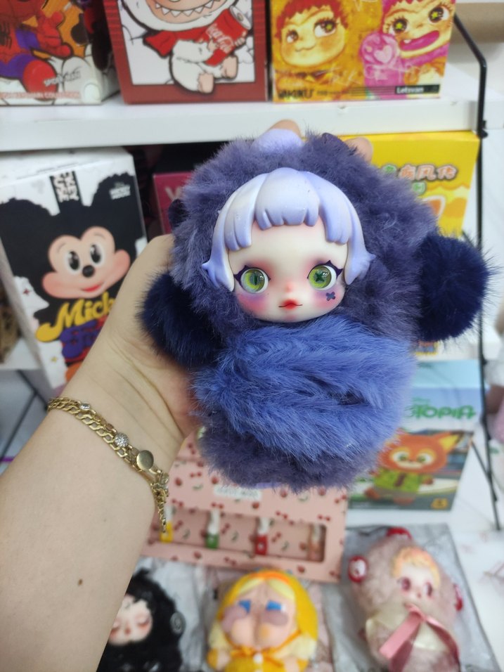 Yeşil gözlü, açık mor saçlı bebeğin sarıldığı yumuşak ve kabarık pastel mor peluş oyuncak.