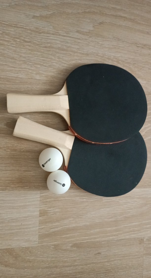 İki adet ahşap saplı masa tenisi raketi ve iki beyaz top. Yalnız 2 defa kullanıldı kauçukta aşınma olmadı.