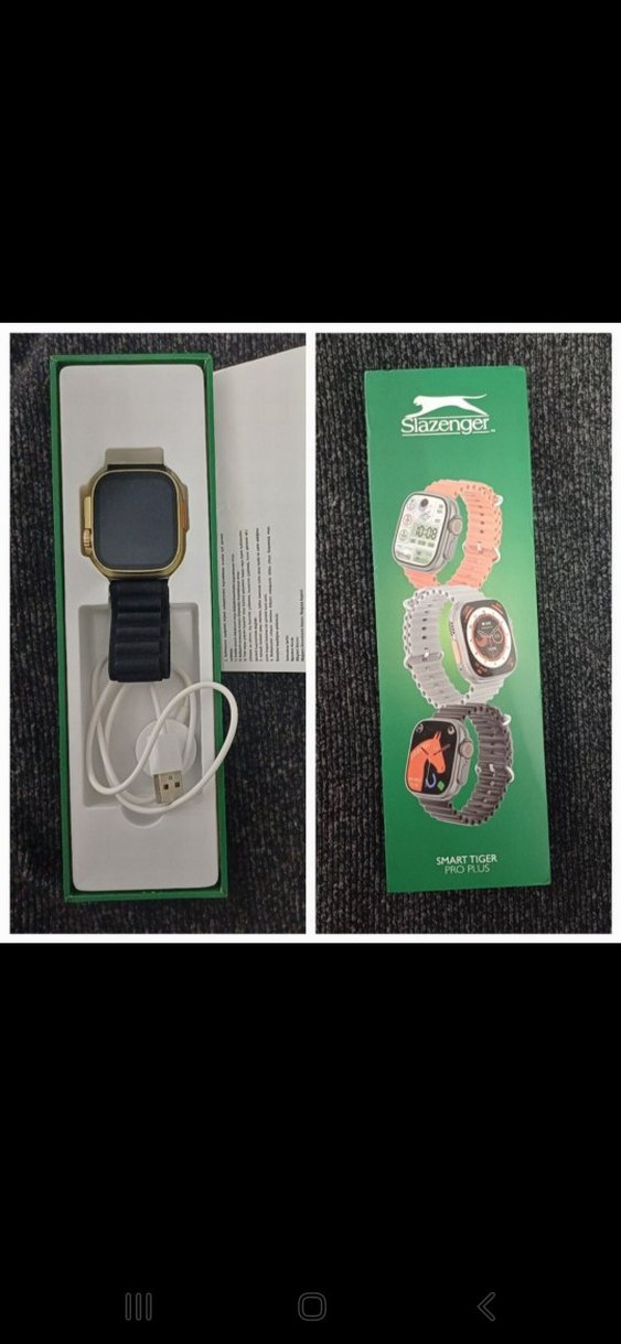 Takas olabilir Slazenger Smart Tiger Pro Plus akıllı saat, koyu altın çerçeve ve siyah kayış ile birlikte gelir. USB şarj kablosu (hediye geldi kullanılmadı)