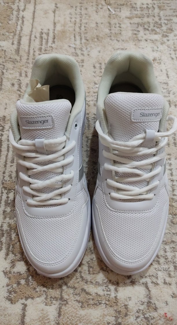 hiç kullanılmadı tertemiz Slazenger marka beyaz bağcıklı spor ayakkabı, ince topuklu ve kauçuk tabanlıdır. Gri detaylı, desen içermeyen sade bir tasarıma sahiptir.
