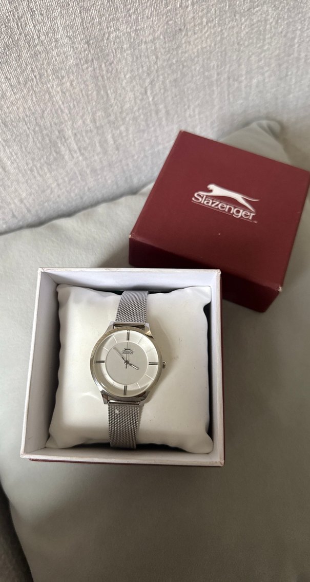 Slazenger kol saati, beyaz minimalist kadran ve gri tokalı file kayış ile klasik zarafet ve sokak stilini birleştiriyor. ⌚ hiç çizik yok