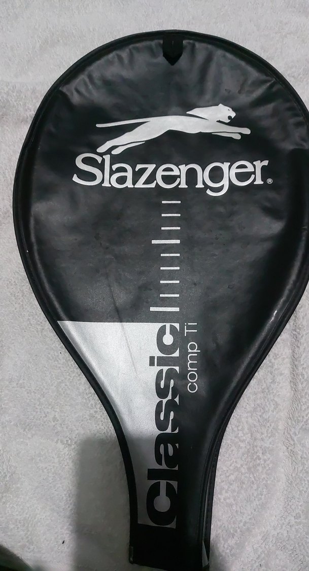 Slazenger logosu ve klasik tasarımıyla siyah tenis raketi ve kılıfı ölçüler boy 69 cm kafa 36x27 cm grip 14 cm yeni gibi