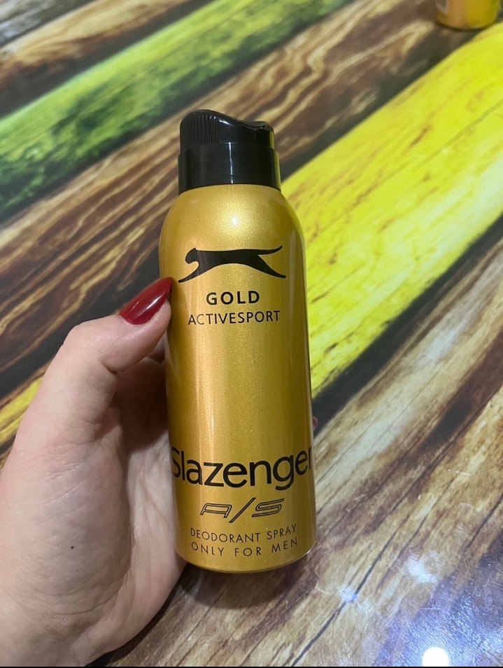 Slazenger Gold Activesport erkekler için deodorant sprey, etkili koku koruması sağlar. Altın renkli şişe siyah kapak ve marka logosu taşır. ♂️
