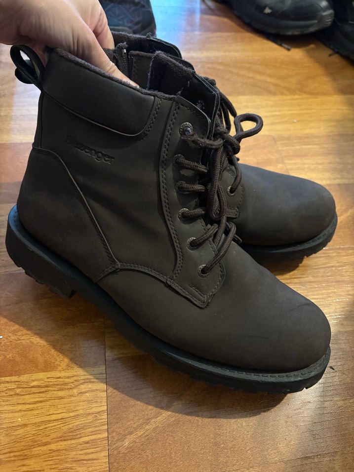 Kahverengi deri, bağcıklı erkek botu. Günlük kullanım için uygun, sokak stiline uygun, koyu renkte ve desensiz. Birkaç defa kullanıldı sorunsuz