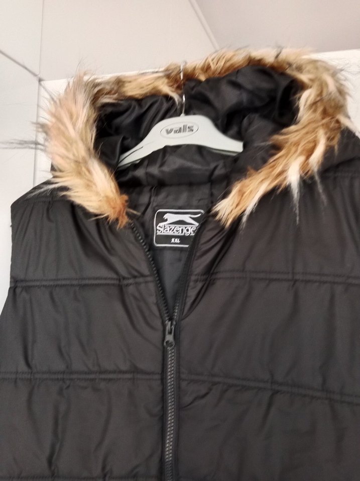 Dar kesim, yüksek yakalı siyah kadın kışlık yelek, kürklü detaylarla sokak stilini yansıtıyor. Sentetik kumaştan, günlük rahat kullanım için uygun.