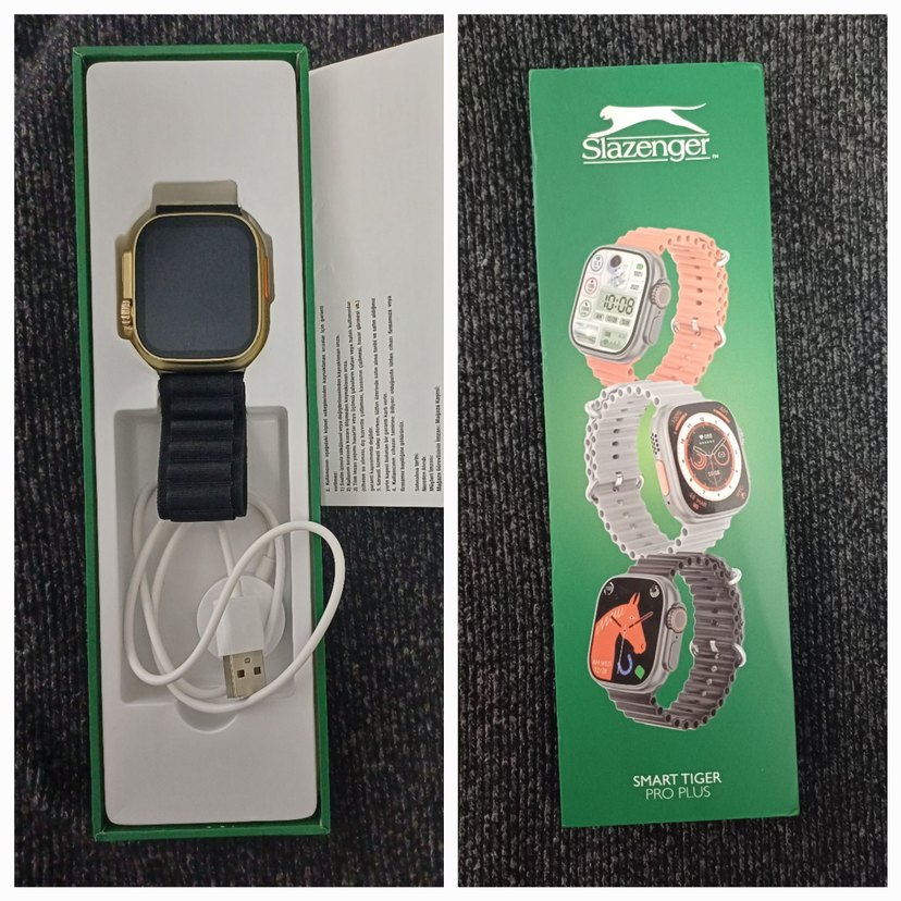 Slazenger Smart Tiger Pro Plus akıllı saat, koyu altın çerçeve ve siyah kayış ile birlikte gelir. USB şarj kablosu (hediye geldi kullanılmadı)