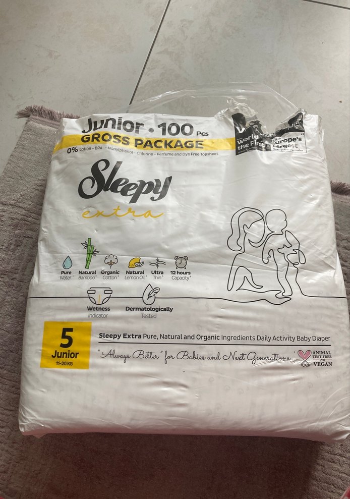Sleepy Junior bebek bezleri saf, doğal ve organik içeriklerle üretilmiştir. 12 saat kapasiteye sahiptir ve dermatolojik olarak test edilmiştir. Pakette 11-20 kg arası 100 adet bez bulunur. bebeğim bezden çıktığı için kullanmıyorum ürünü açtık ama içinden 10 adet kadar kullanmış olabilirim.Son kullanma tarihinde ekledim (2029) bu sene alınan bir bezdir.90 adet