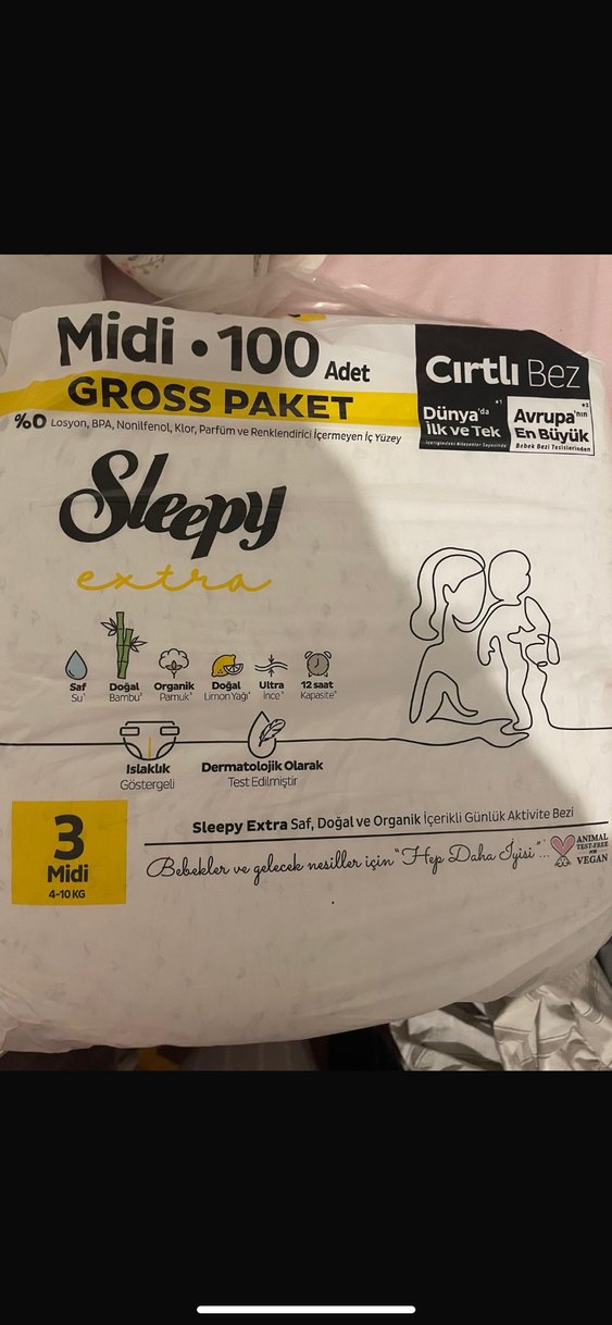 Sleepy Midi 3 numara bebek bezleri 4-10 kg arası bebekler için 100 adet olarak sunulur. Dermatolojik olarak test edilmiş, doğal ve organik içeriklidir, 12 saate kadar koruma sağlar. Bezler losyon, BPA, klor, parfüm ve renklendirici içermez. Hiç açılmamış paketi