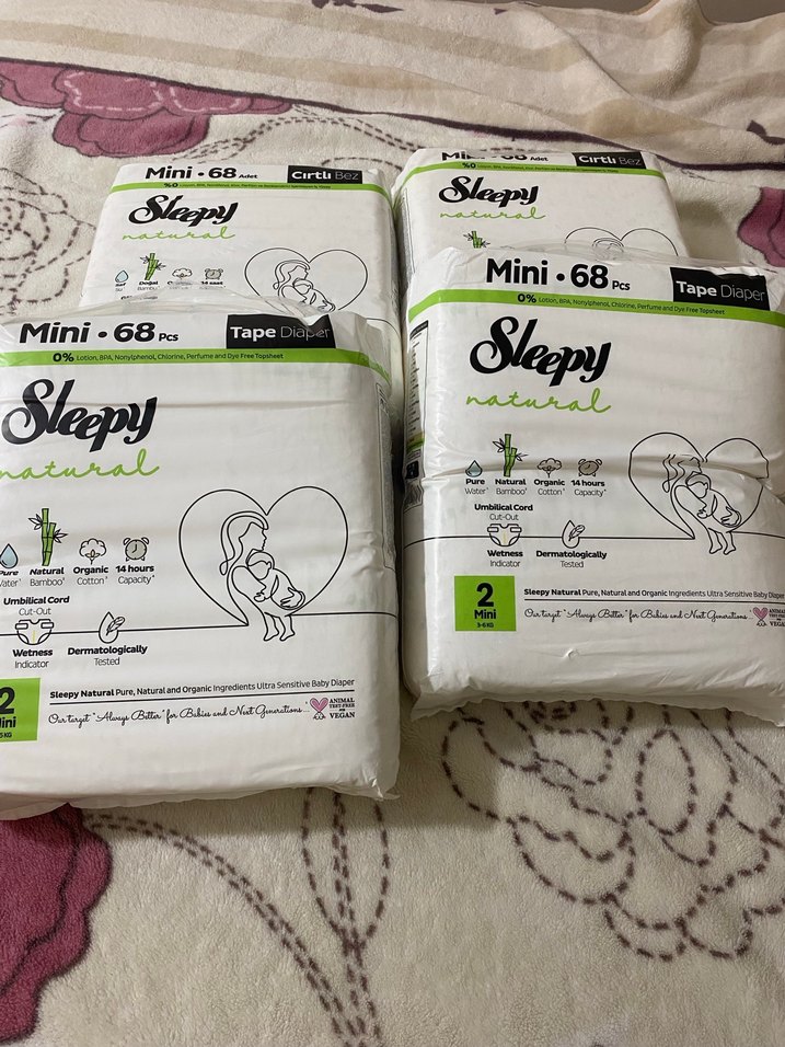 Sleepy Mini bebek bezleri, 68'li paketlerde, doğal malzemelerle üretilmiş ve 14 saat emiciliğe sahip. Dermotolojik olarak test edilmiştir. Fazla geldiği için küçük geliyor açılmamış paketler 4 paket 272 adet