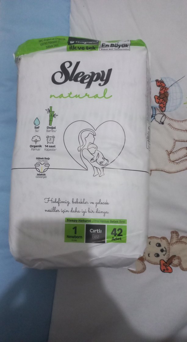 Sleepy Natural yenidoğan bebek bezi, organik pamuk, doğal bambu ve 14 saat emicilik sağlar. 42 adet bez içerir.