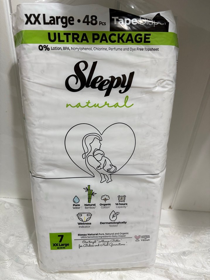 Sleepy Natural XXL bebek bezleri, 48 adetlik pakette doğal bambu ve organik pamuktan üretilmiştir. Losyon, BPA, klorin, parfüm ve boya içermez, 14 saat nem koruması sağlar.