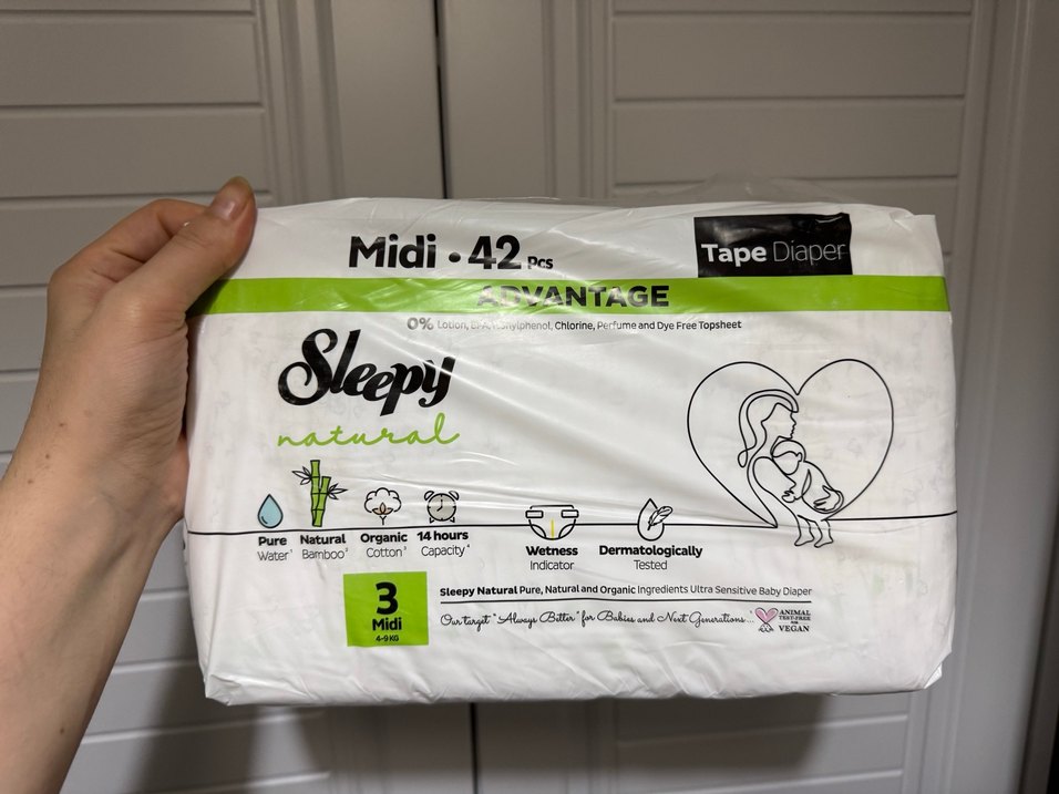 Sleepy Natural Midi bebek bezleri, organik pamuk ve doğal bambu içerir. 14 saat kapasite, dermatolojik testli, ıslaklık göstergeli ve saf su kullanılır. Parfüm ve klor içermez.
