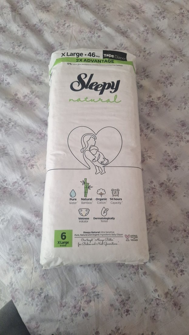 Sleepy Natural XLarge bebek bezleri, saf ve doğal bambu malzeme ile organik pamuk içerir, 14 saate kadar koruma sağlar. Islaklık göstergesi ve dermatolojik testlidir.15-25 kg