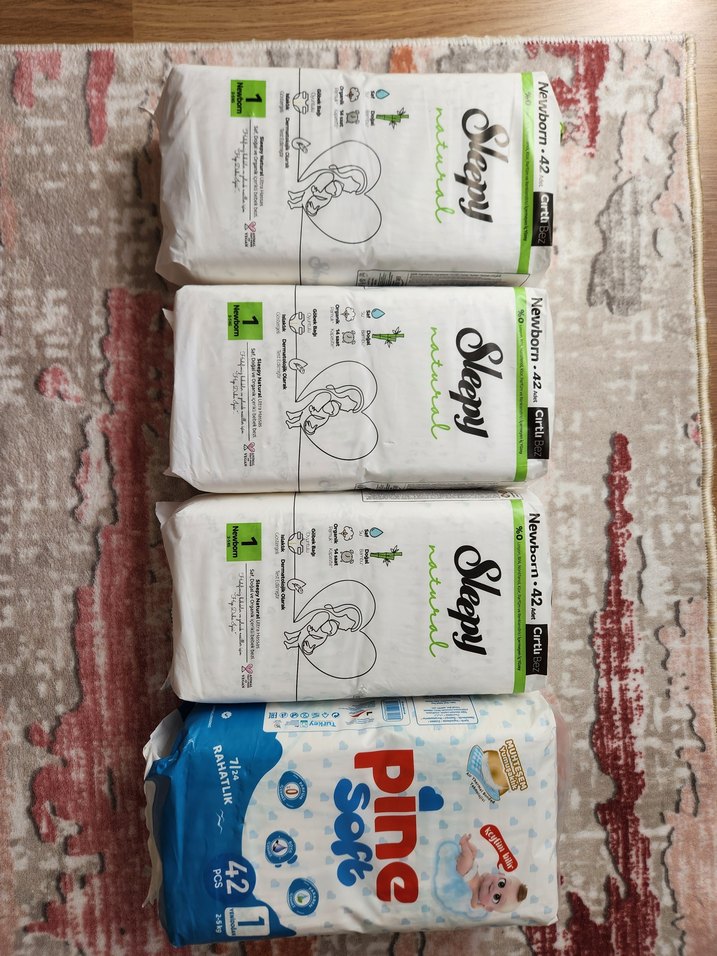 Sleepy Newborn bebek bezleri 42 adet olarak satılır, yenidoğanlar için yumuşak ve emici yapıya sahiptir. Pine Soft bezler de 42'li pakette yumuşaklık ve konfor sunar. 4 paket bebek bezi sadece sleepy bir tanesinin içinden denemek için bir tane çıkarıldı. ihtiyaç fazlasıdır.