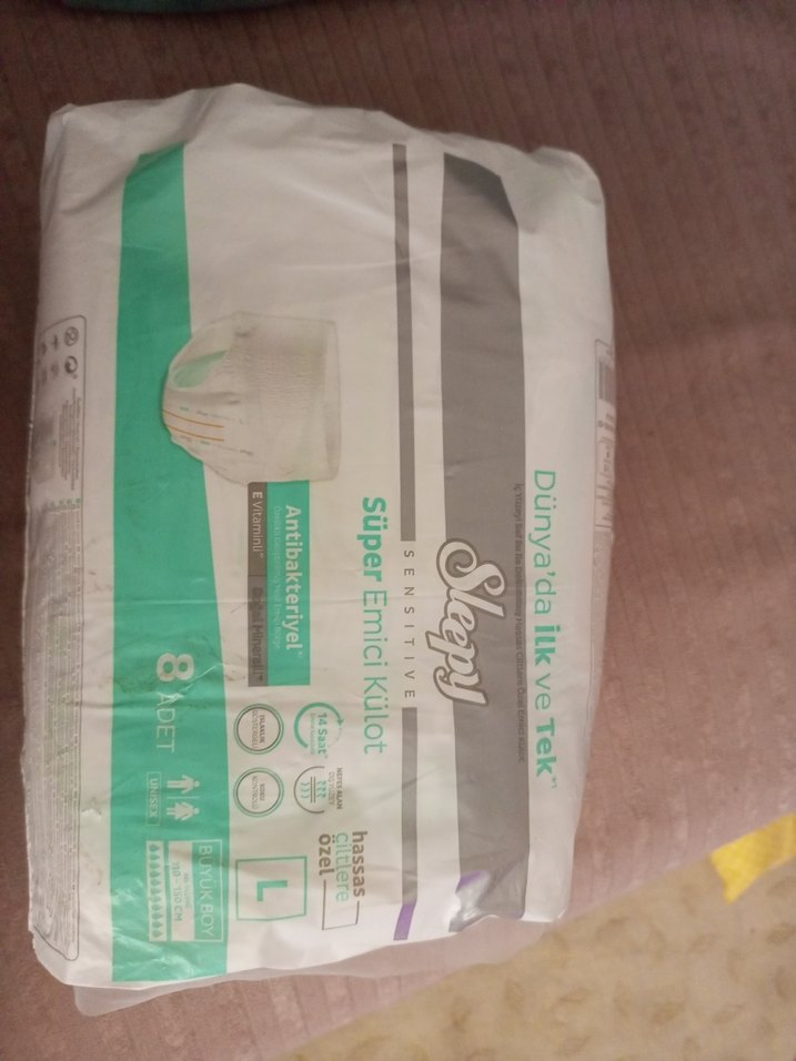 Sleepy Sens antibakteriyel süper emici katmanlara sahip hassas cilt için özel külot bez, L beden, 8 adet. bebek için diye aldık açtıktan sonra farkettim.ustunu hemen kapattım. eksiği yok