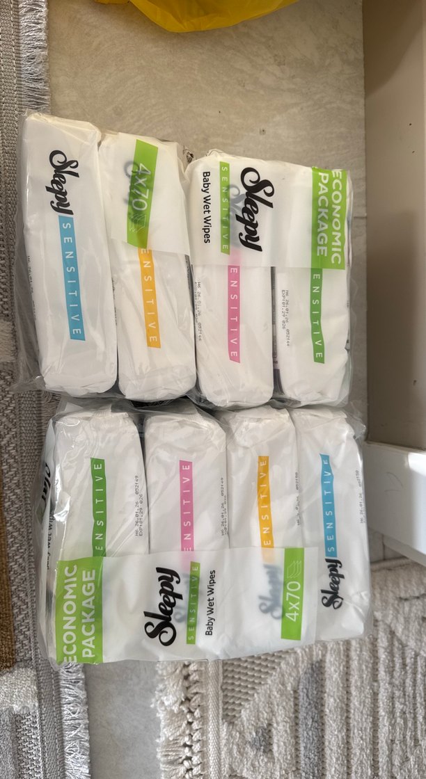 Sleepy Sensitive bebek ıslak mendiller, dört pakette 70 yaprak olmak üzere ekonomik paket halinde, hassas bakım için uygundur.