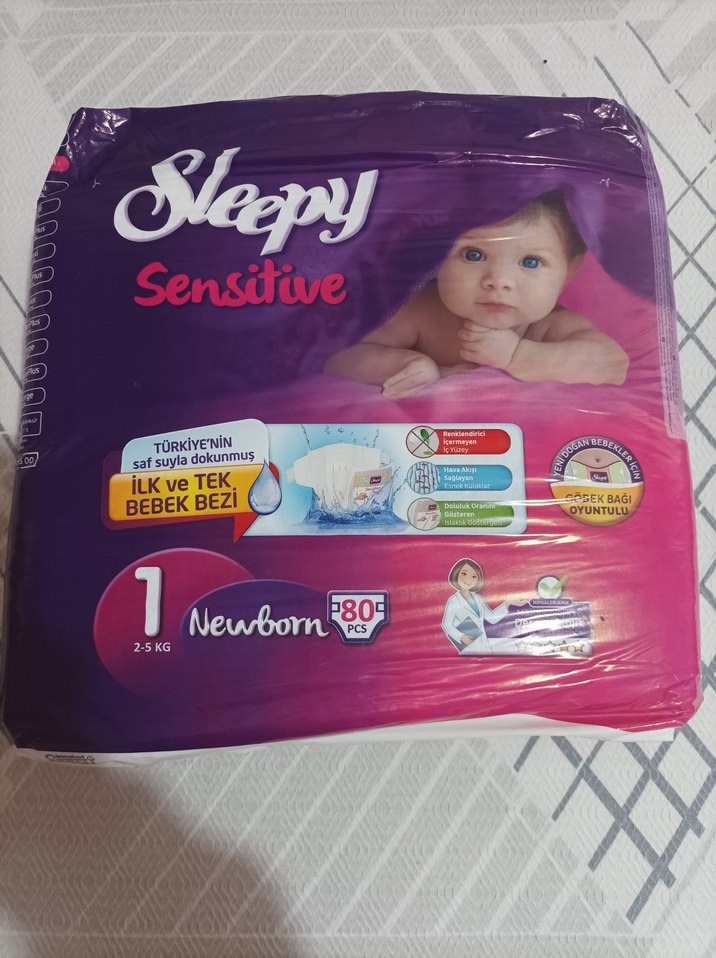 Sleepy Sensitive yeni doğan bebek bezi, 2-5 kg arası bebekler için saf pamuk dokunuşlu hassas cilt dostu kumaşa sahiptir. 80 adetlik pakettir.