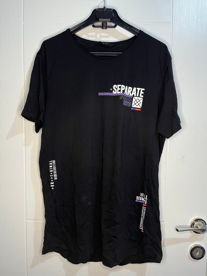 Siyah renkli, baskılı grafiklere sahip erkek tişörtü. Kısa kollu, bisiklet yaka, sentetik kumaştan üretilmiştir. M beden. Hiç kullanılmadı.