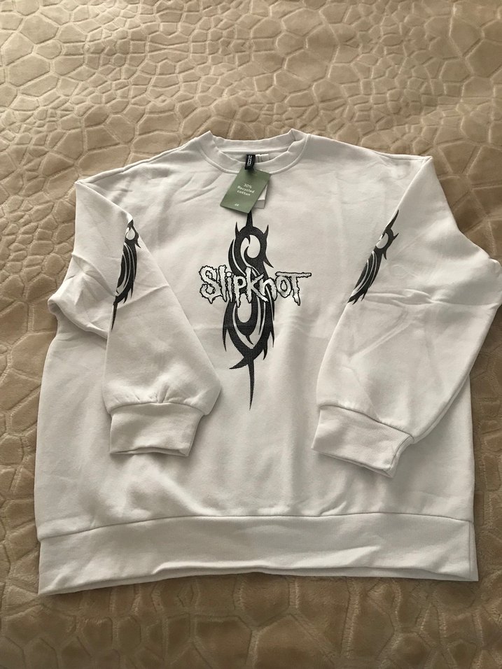 Slipknot baskılı beyaz sweatshirt, uzun kollu ve yuvarlak yakalıdır. Pamuklu örme kumaştan, rahat kesim ve baskılı desenlere sahiptir. Günlük kullanıma uygundur.