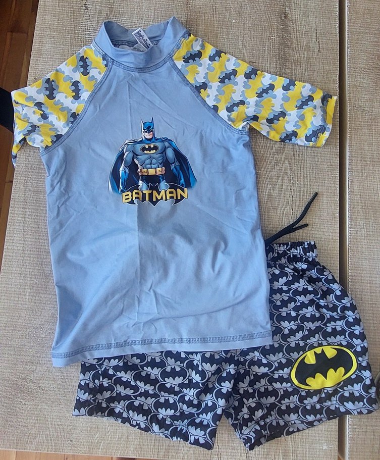 skipstop uv korumalı Batman baskılı kısa kollu üst ve mayo şortundan oluşan erkek çocuk mayo takımı. Ürünün şimdiki fiyatını da görsellere ekledim. üst beden 8-9 yaş alt beden 6-7 yaştır.ürün sadece 1 ya da 2 kere giyildi dar geldiği için giyemedi sıfırdan farksızdır.