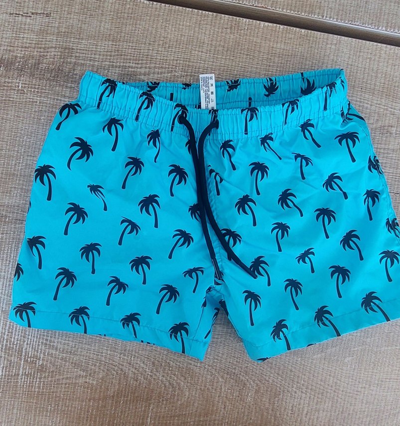 Renkli mavi zemin üzerine siyah palmiye desenleriyle mini erkek deniz şortu. ürün dar geldiği için 1 ya da 2 kez giyildi oldukça temizdir.